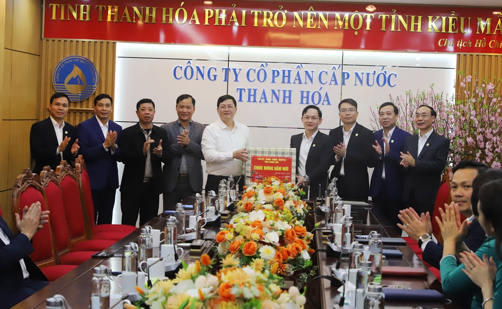 | Phó Chủ tịch Thường trực UBND tỉnh và đoàn công tác chúc Tết, tặng quà Công ty CP Cấp nước Thanh Hóa. |