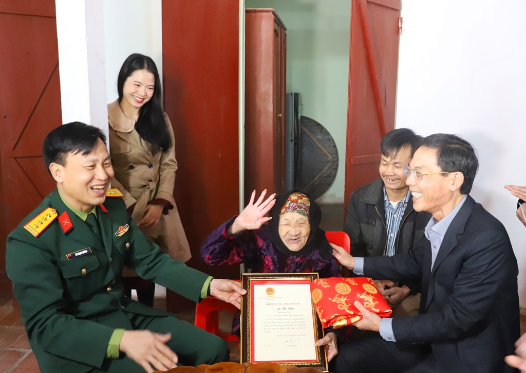 | Phó Chủ tịch UBND tỉnh Đầu Thanh Tùng và các thành viên trong đoàn thăm hỏi, trao quà và thiếp chúc thọ của Chủ tịch nước tặng cụ Lê Thị Kiêu, tròn 100 tuổi (thôn Minh Sơn, xã Nông Cống). |