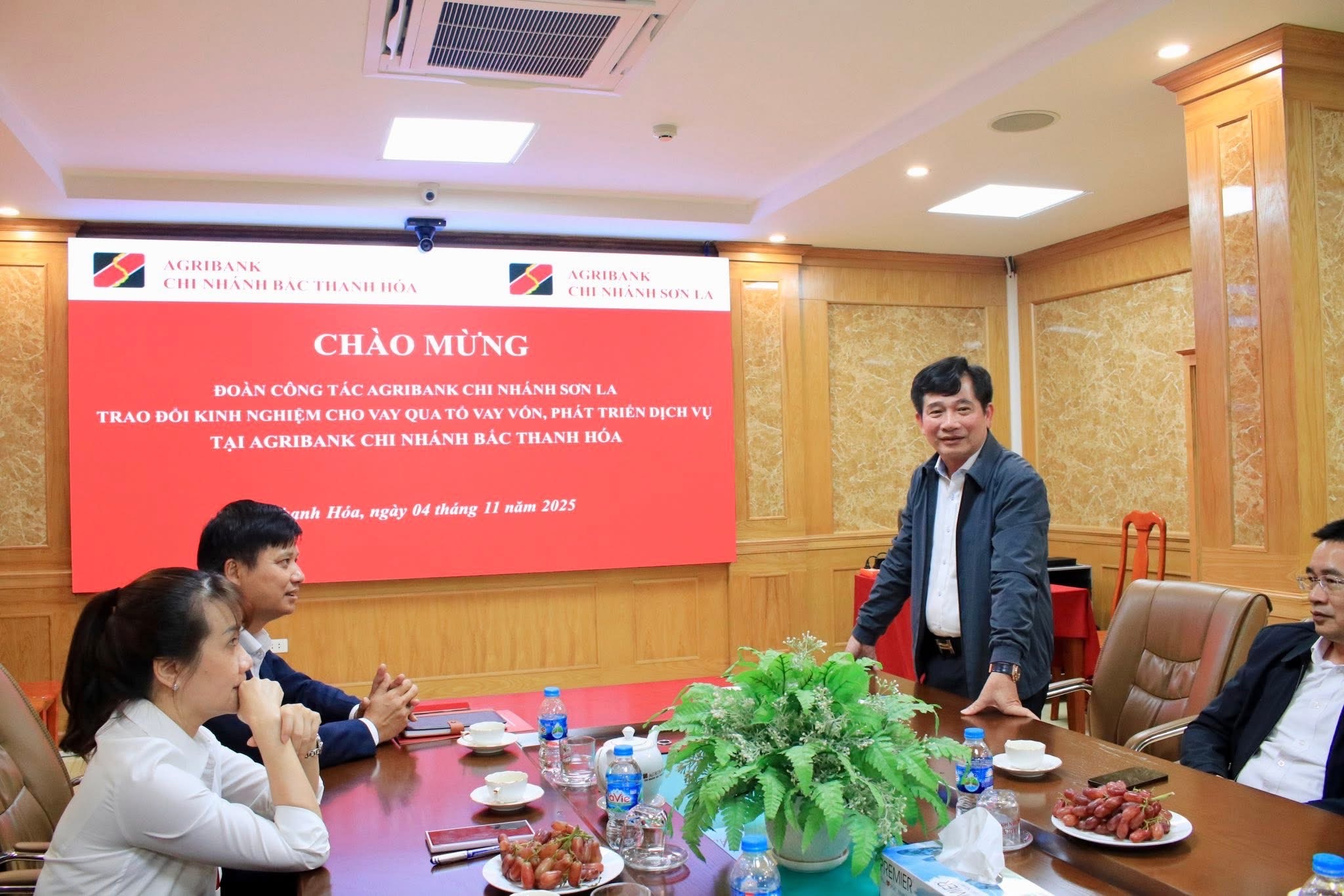 Ngày 04/11/2025, Agribank Chi nhánh Bắc Thanh Hóa đã đón tiếp và làm việc với Đoàn công tác Agribank Chi nhánh Sơn La nhằm trao đổi kinh nghiệm triển khai cho vay qua tổ vay vốn, tăng hiệu quả tín dụng nông thôn, đẩy mạnh phát triển sản phẩm - dịch vụ và chia sẻ kinh nghiệm chuyển đổi số trong hoạt động ngân hàng.